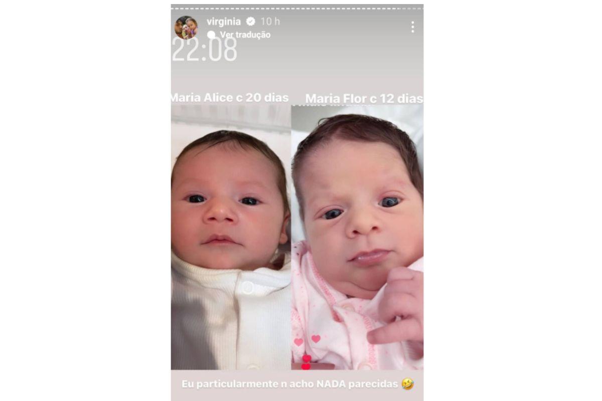 Virginia Fonseca postou uma comparação das suas duas filhas, Maria Alice e Maria Flor, quando eram bebês nessa quinta-feira, dia 3 de novembro. Em seus stories do Intagram ela compartilhou a dessemelhança das meninas com quase os mesmos dias de vida.