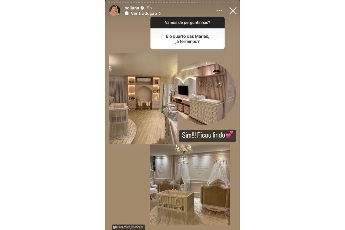 No Instagram, Poliana abriu uma caixa de perguntas, quando recebeu uma sobre o quarto. “E o quarto das Marias, já terminou?”, um fã questionou.“Sim! Ficou lindo”, respondeu ela, mostrando fotos do quarto luxuoso. Ele foi inteiro projetado com tons de rosa claro, três berços e até lustre de cristais. Em uma das fotos é possível ver uma mesa com duas cadeiras com encosto de asas de borboleta.