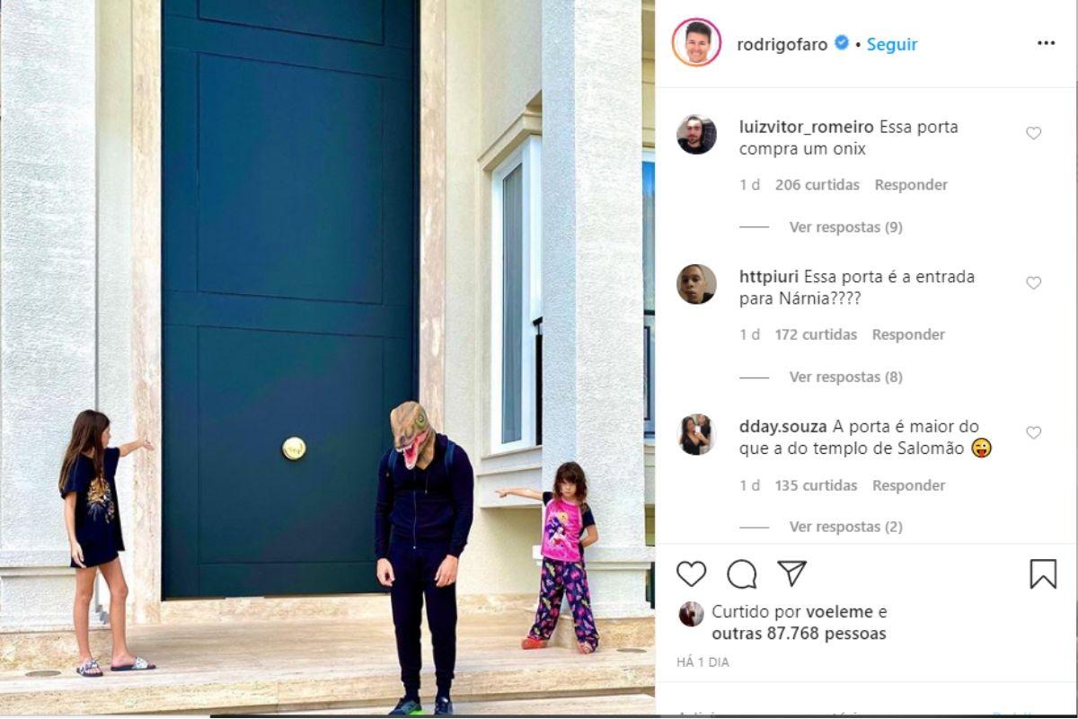 Na última segunda-feira, 9 de junho, o apresentador Rodrigo Faro, foi alvo de memes e piadas na internet após compartilhar uma foto em frente a porta da sua casa, ao lado das filhas. Apesar de não ser objetivo mostrar a entrada da casa, a publicação chamou a atenção dos seguidores por um detalhe, nada convencional: porta gigantesca da mansão!