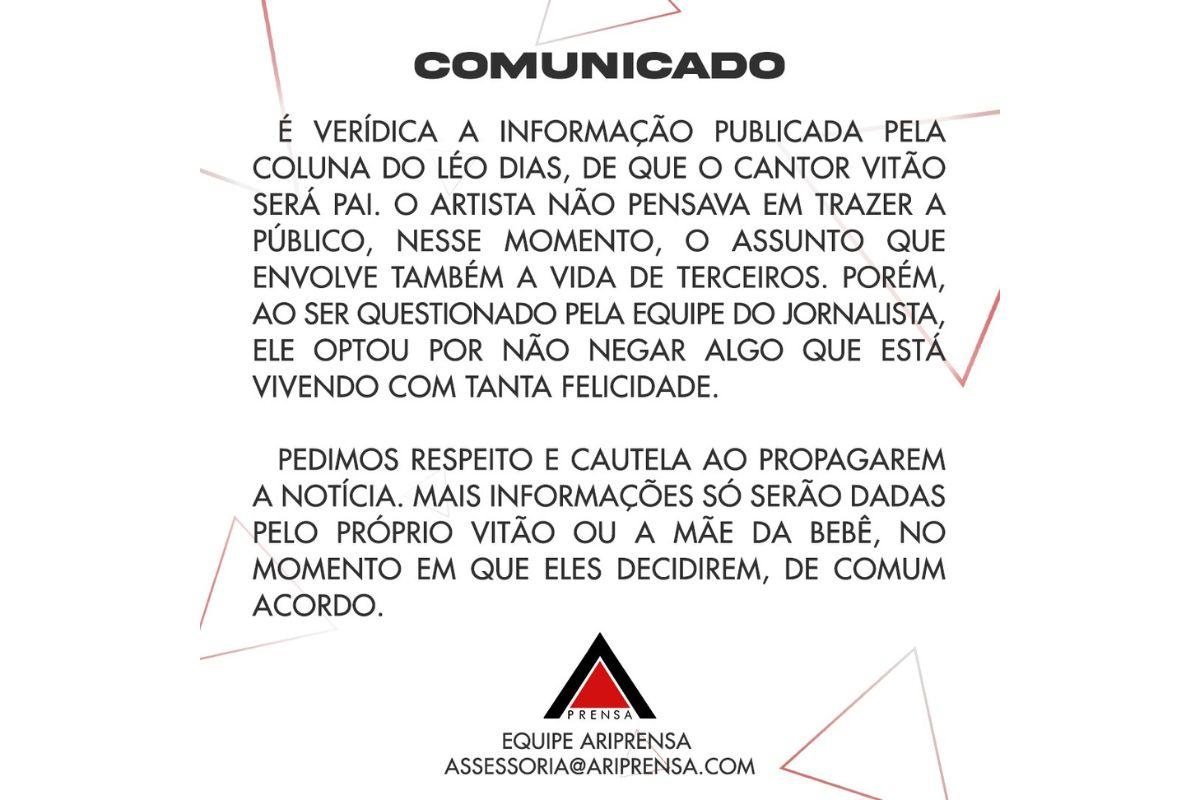 Comunicado da assessoria de imprensa de Vitão (Foto: Pais&Filhos)