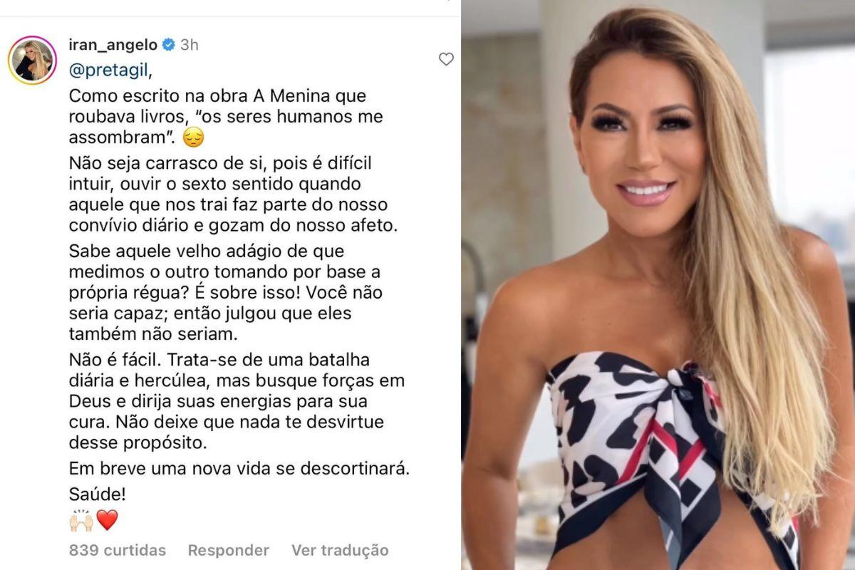 A empresária Iran Ângelo, ex-esposa do jogador Hulk Paraíba, se manifestou em apoio a Preta Gil após a cantora dar detalhes da traição que sofreu do então marido, Rodrigo Godoy. Iran também já foi vítima de traição.