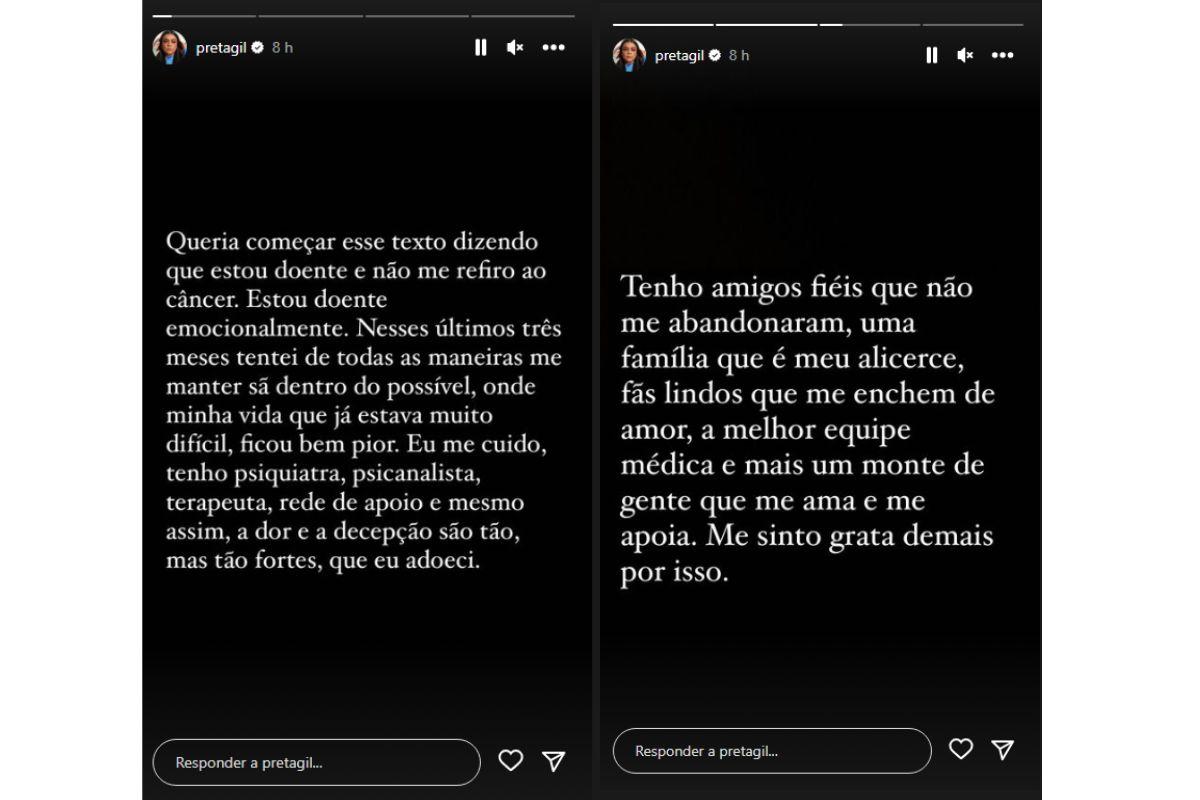 A cantora Preta Gil, de 48 anos, fez um desabafo em seu Instagram, na madrugada desta quarta-feira, 12 de julho, e anunciou que vai se afastar das redes sociais. A artista está tratando um câncer de intestino e ainda precisou lidar, ao mesmo tempo, com uma traição de ex-marido, Rodrigo Godoy.