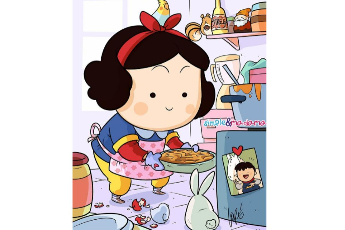 Não poderia faltar a clássica das clássicas na série de ilustrações da dupla italiana! Branca de Neve aparece, na homenagem, aproveitando os dons culinários para assar a clássica torta de maçã. Antes feita para os 7 anões, aqui a sobremesa será muito aproveitada por ela e pelo príncipe – que deixou foto e recadinho para a esposa grudados no fogão!
