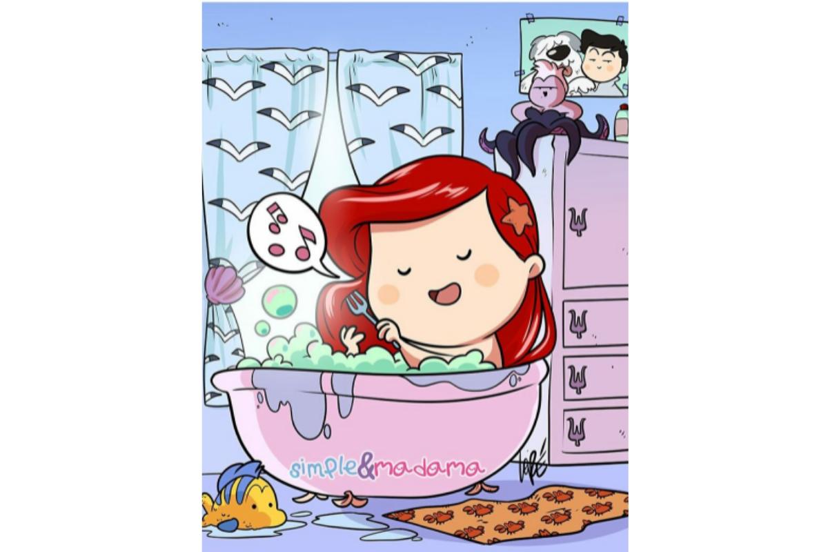 Ariel não abre mão da água mesmo dentro de casa. Por isso, foi ilustrada penteando os cabelos na banheira – aproveitando o autocuidado durante a quarentena. Para os mais atentos, é possível ainda enxergar o tapete com estampas de caranguejo – tal qual seu conselheiro e amigo Sebastião! – e uma pelúcia molhada do peixinho e melhor amigo Linguado.
