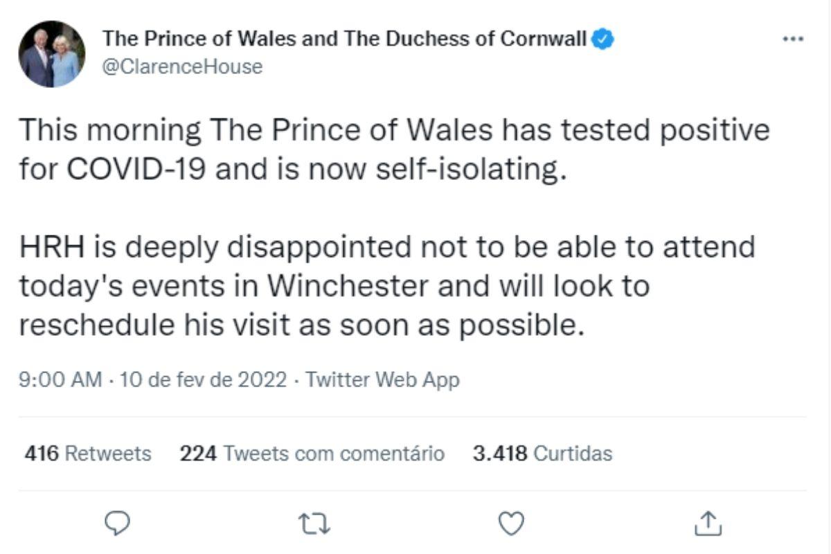 “Esta manhã, o Príncipe de Gales testou positivo para Covid-19 e agora está em autoisolamento. HRC está profundamente desapontado por não poder comparecer aos eventos de hoje em Winchester, e tentará reagendar sua visita o mais rápido possível”, diz o comunicado oficial.