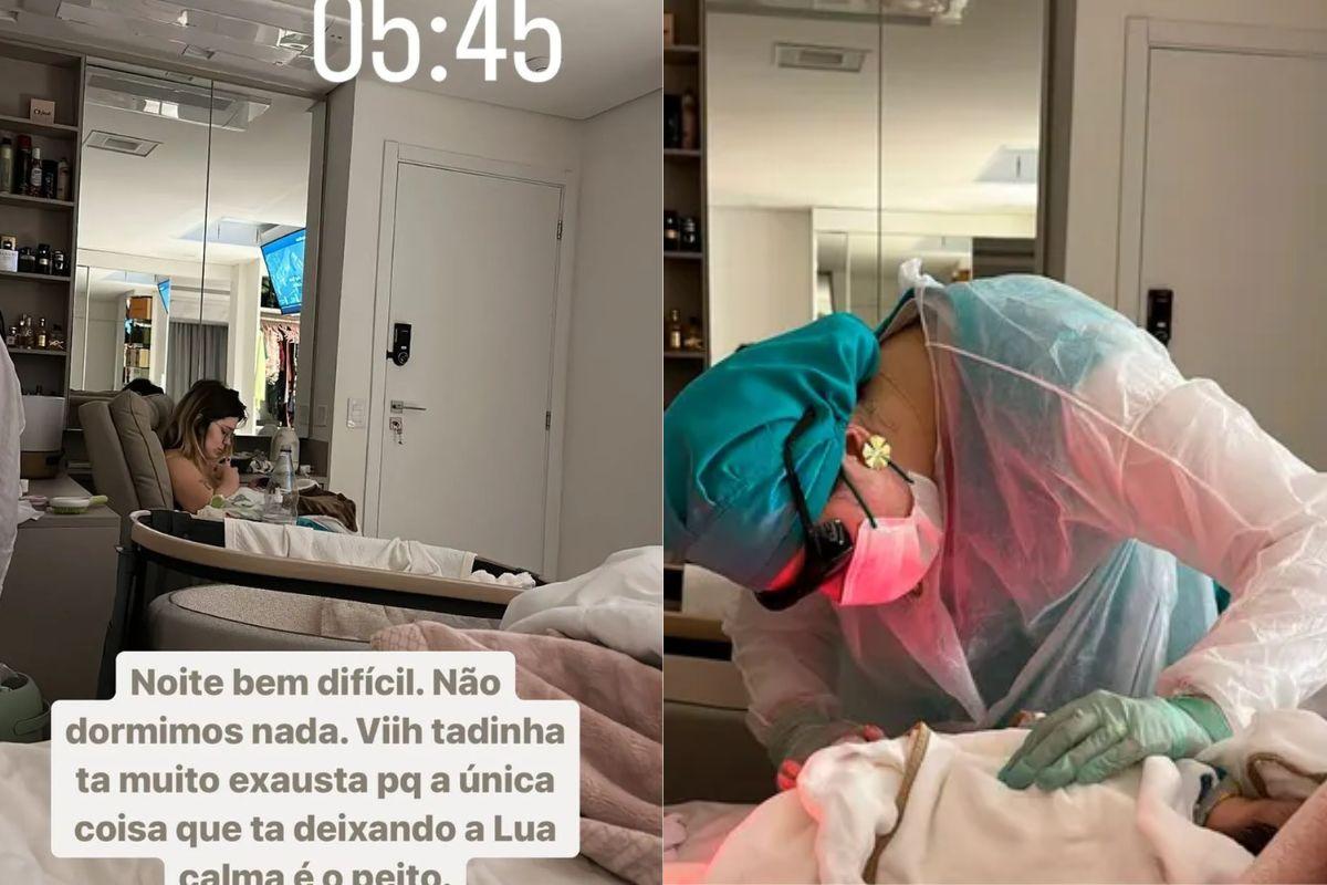 “Corta meu coração saber que ela está sentindo dor. Nossa mãe”, foi o relato dele as 5h45 da manhã. Em seguida, ele disse: “Noite bem difícil, não dormimos nada. Viih tadinha, está exausta porque a única coisa que está deixando a Lua calma é o peito”, seguiu ele.