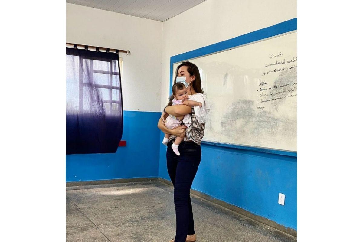 A professora está em uma foto com o bebê de Larissa, aluna do 2° ano do ensino médio. “Esta no meu colo é Maria Alice, filha de Larissa. Larissa que não aparece na foto, está no 2º ano do ensino médio. Se tornou mãe ainda estudando, e tomou uma decisão muito difícil: ou deixava os estudos para cuidar da filha, ou a levava para a escola para poder melhorar seu futuro”, iniciou a professora.