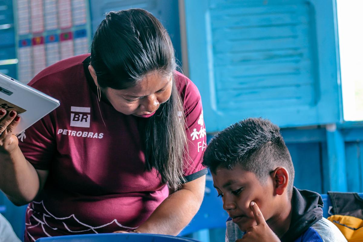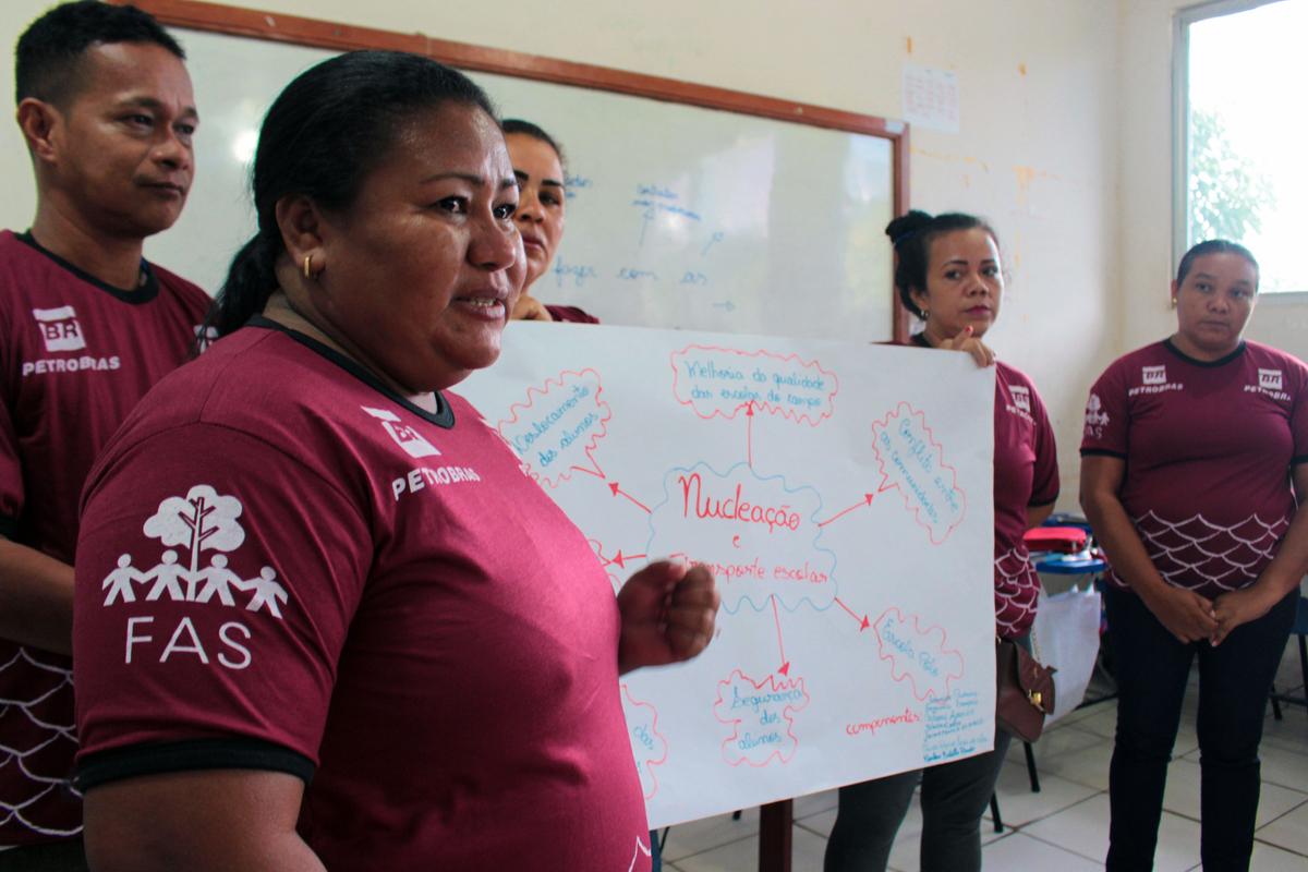 Joleíse dá aula para uma sala com diversos alunos de séries diferentes. Eles aprendem, ao mesmo tempo, conteúdos diferentes, de matérias e disciplinas diversificadas. Pensando nisso que o Projeto Amazonas Sustentável, fruto de uma parceria da Petrobras, decidiu dar uma chance aos professores das classes multisseriadas.