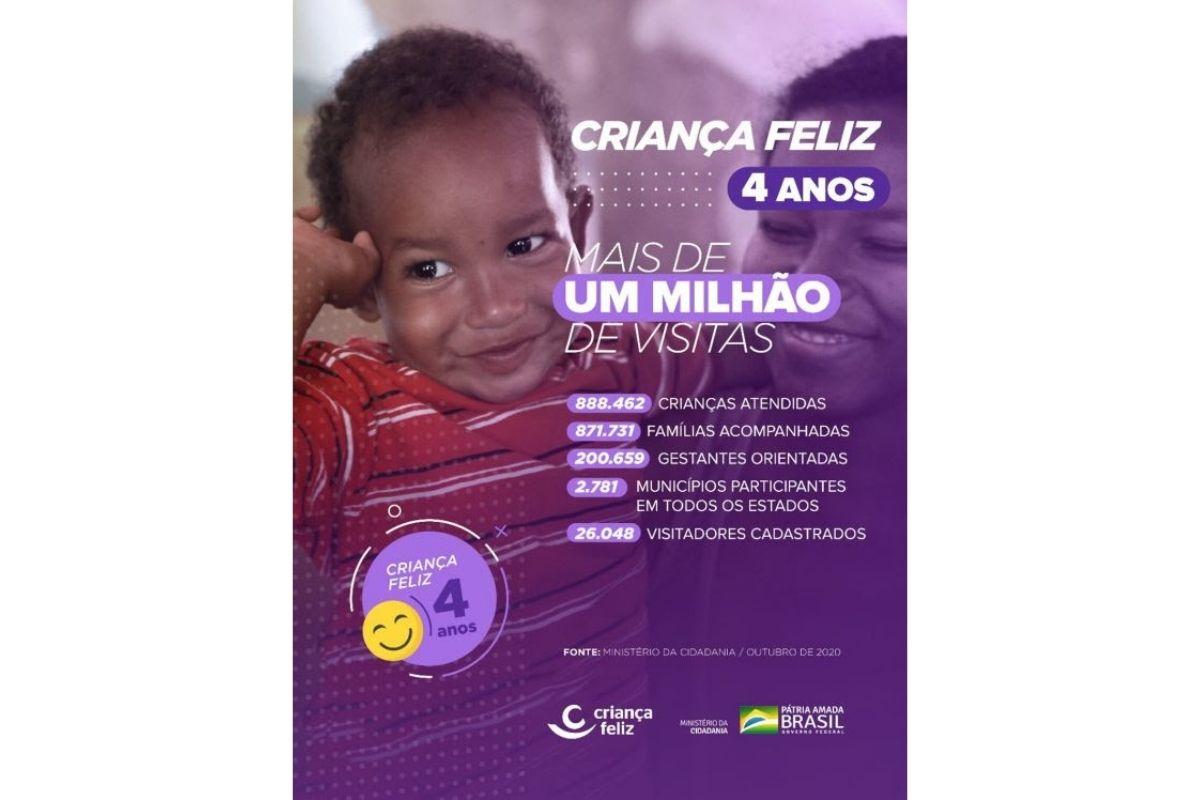 Em outubro de 2020, o Criança Feliz, maior programa de visitação domiciliar para a primeira infância no mundo, completa quatro anos com mais de um milhão de visitas registradas em todos os estados. Até o momento, são 26.048 profissionais cadastrados para acompanhar 888 mil crianças e 200 mil gestantes nos 2.781 municípios.