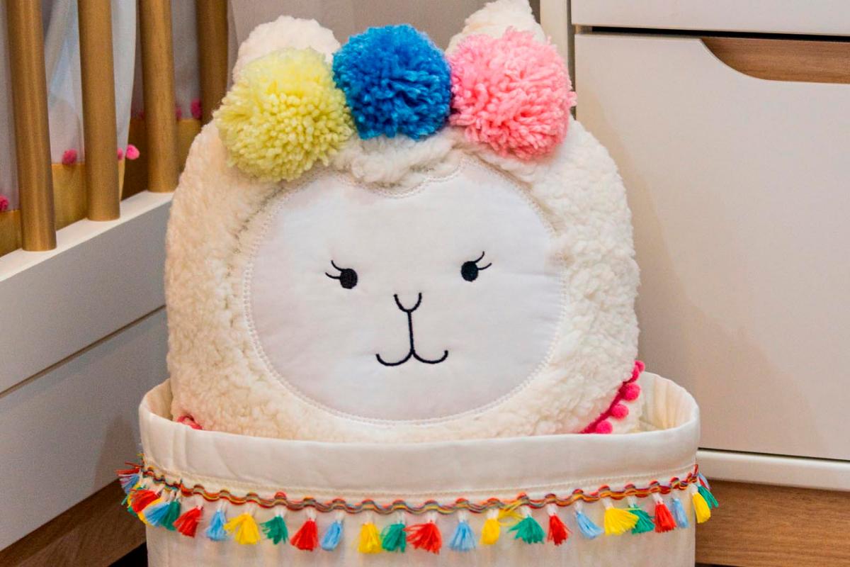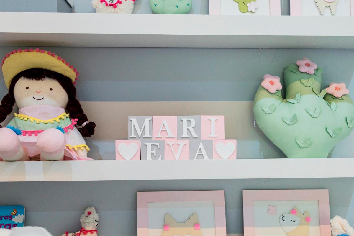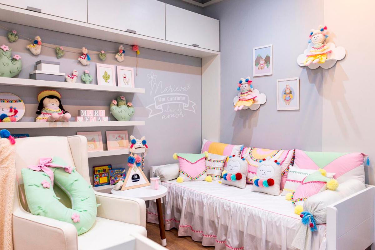 A decoração ficou linda com um tema mais clean e, ao mesmo tempo, colorido. Foi inspirada no conceito Hippie Chic e tem vários detalhes lindos, como pompons coloridos e cactos de pelúcia. O grande destaque da decoração são as lhamas que, na América do Sul, representam felicidade. Elas estão presentes em pelúcia e almofadas temáticas no quarto da Marieva.