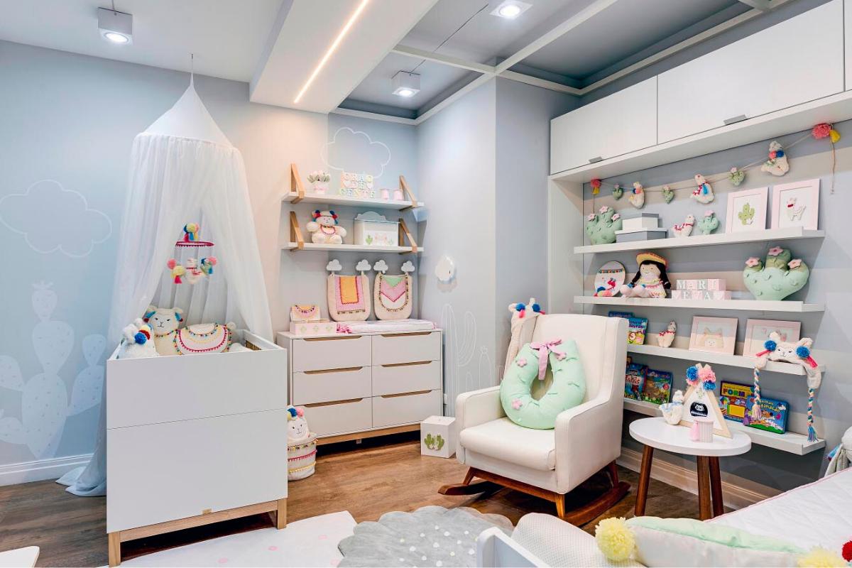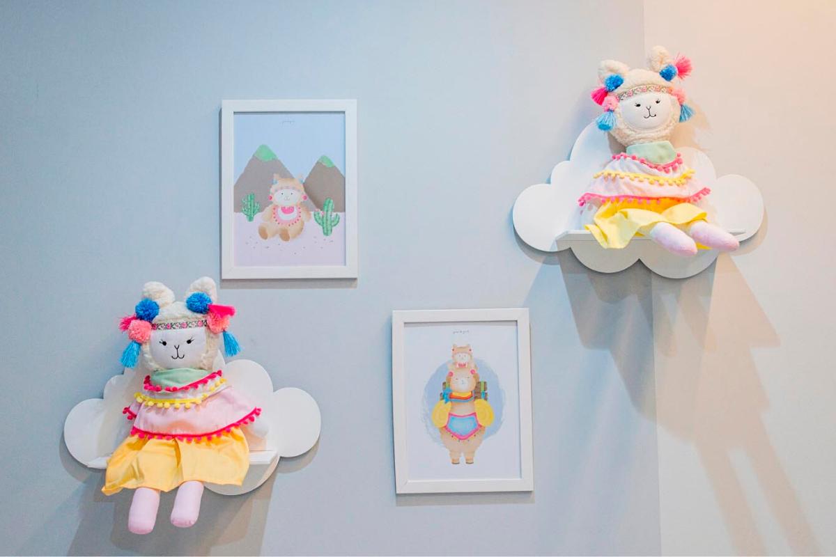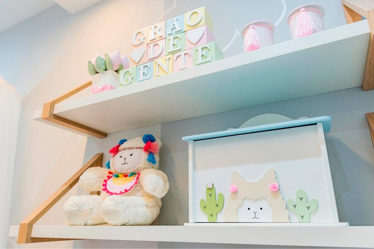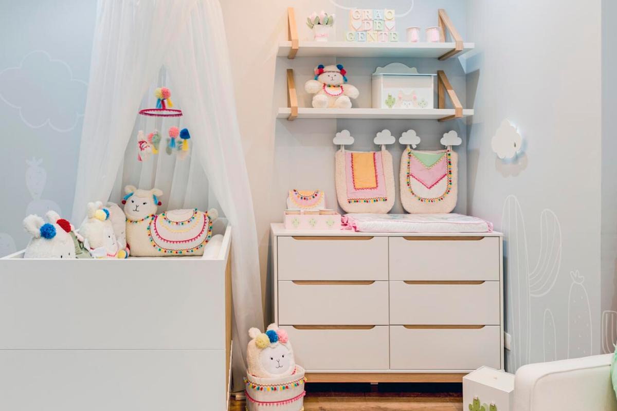 A decoração ficou linda com um tema mais clean e, ao mesmo tempo, colorido. Foi inspirada no conceito Hippie Chic e tem vários detalhes lindos, como pompons coloridos e cactos de pelúcia. O grande destaque da decoração são as lhamas que, na América do Sul, representam felicidade. Elas estão presentes em pelúcia e almofadas temáticas no quarto da Marieva.