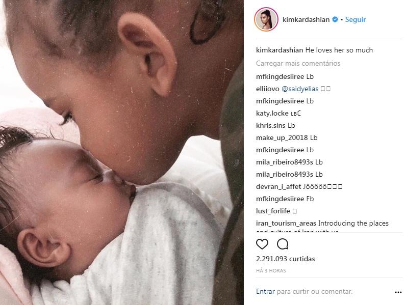 Ver o carinho entre os nossos filhos é um dos melhores presentes que podemos ter! Irmãos são nossos primeiros amigos e os pais devem incentivar muito esse amor e essa parceria. Neste sábado (31) a empresária Kim Kardashian publicou uma foto em seu Instagram mostrando o filho Saint, de 2 anos, dando um beijo na caçula da família, Chicago.