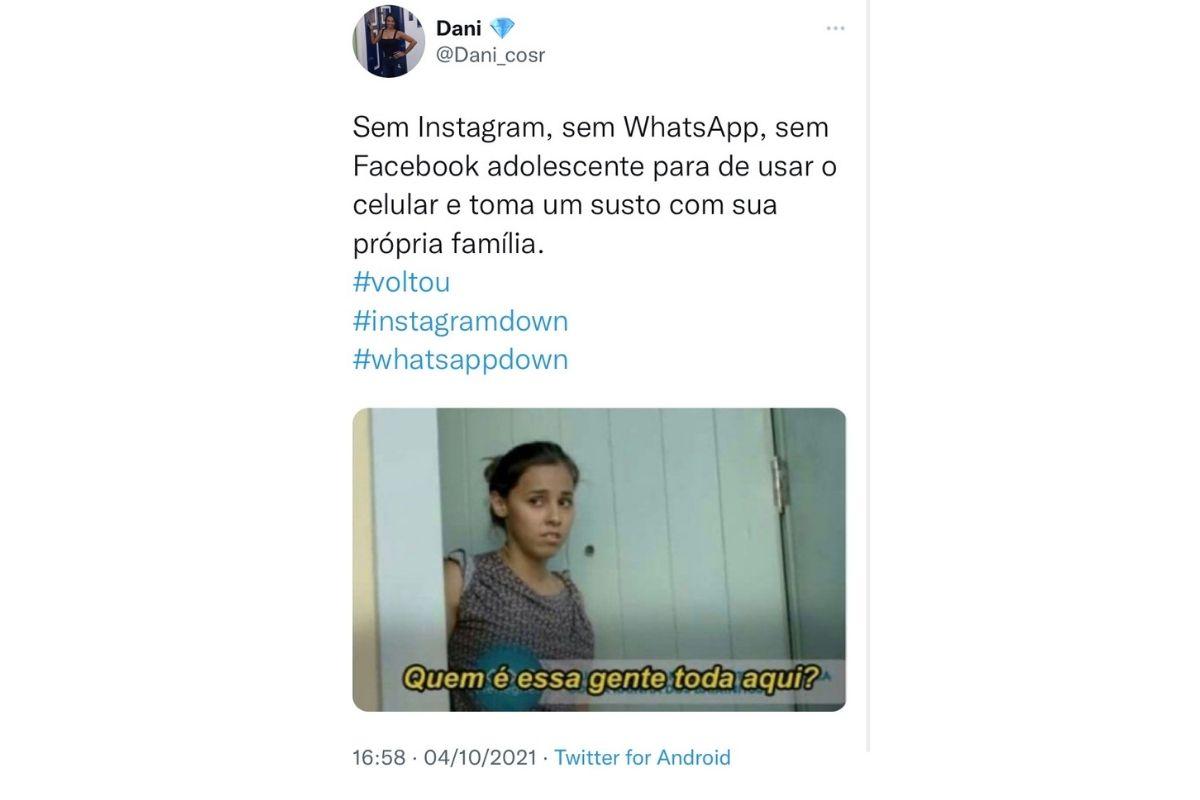 Nesta segunda-feira (4), o WhatsApp, Facebook e Instagram permaneceram fora do ar por cerca de 6h em todo o mundo. O pane foi considerado o mais prolongado em toda a história. Por conta disso, durante a tarde, diversas piadas foram feitas pelos internautas em outras plataformas digitais.