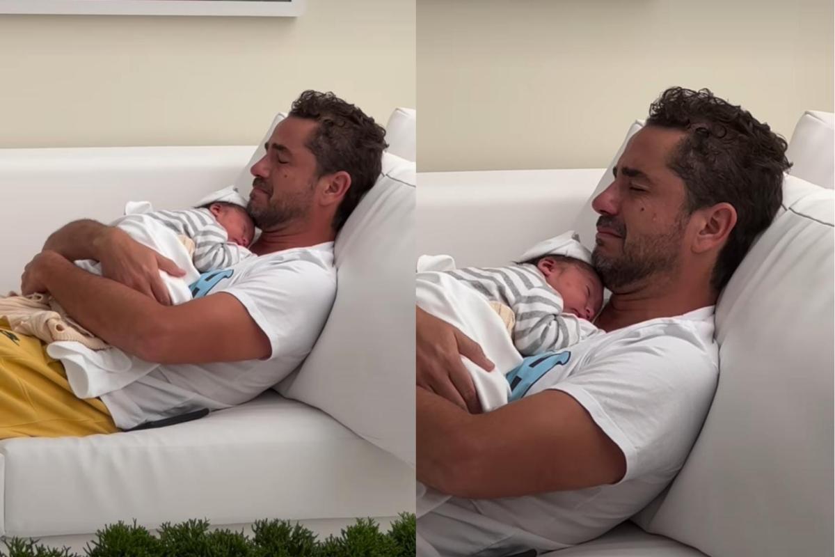 O casal tinha acabado de ganhar Leon e o jornalista não aguentou segurar as emoções segurando o filho enquanto ele dormia no colo do pai. Rafa aproveitou o momento para filmar a cena e ainda colocou o vídeo no Instagram com uma legenda emocionante.