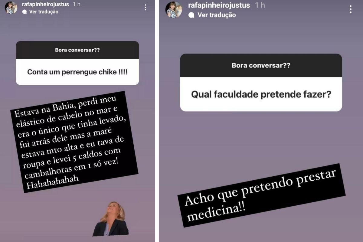 Alguns internautas, ainda, perguntaram sobre como ela é na escola. Rafa contou que está no sétimo ano e se cobra muito nos estudos. Ela ainda falou sobre os planos para o futuro quando uma pessoa perguntou qual profissão ela pretende seguir. “Acho que pretendo prestar Medicina!”, contou ela.