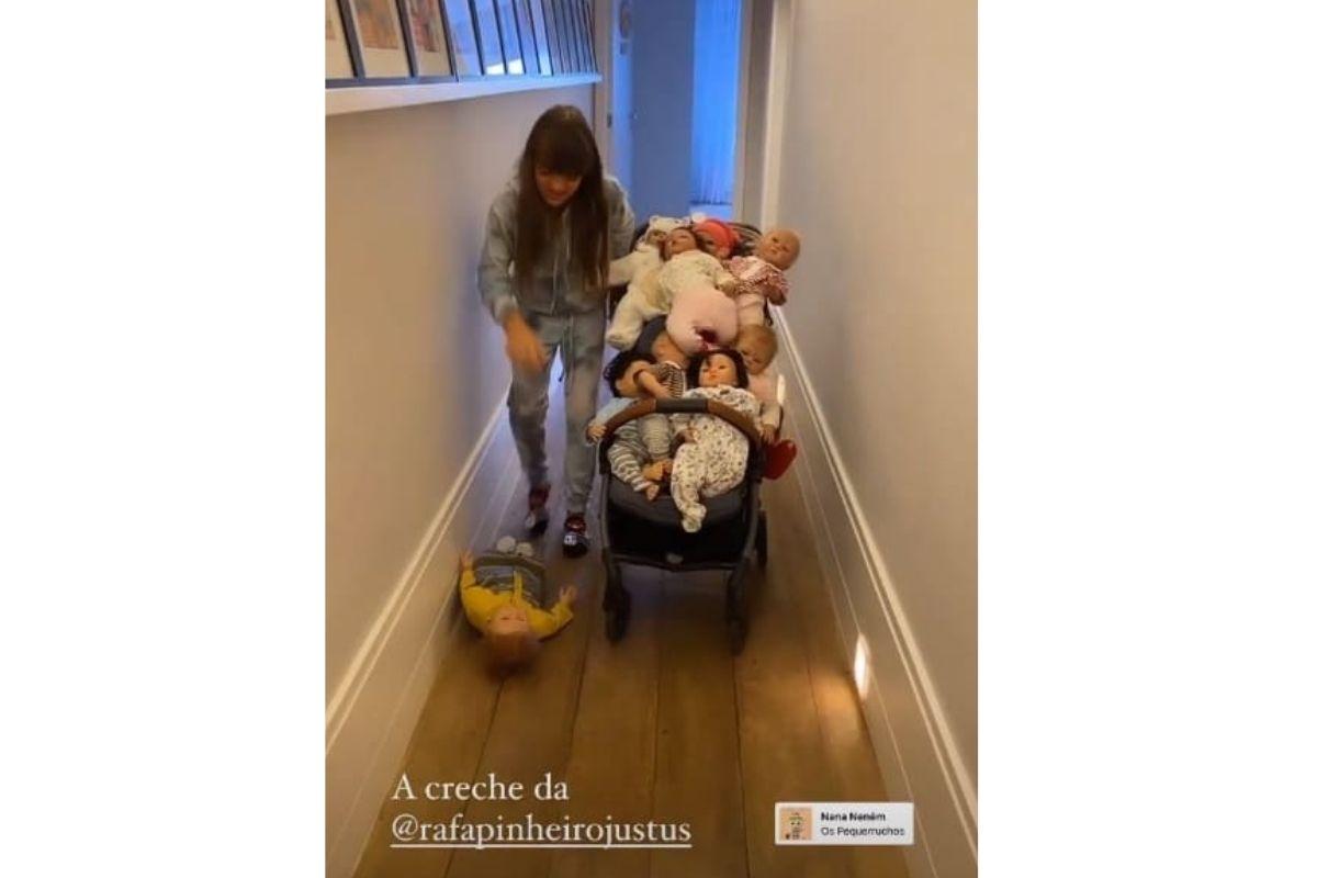 Rafa mostrou que tem uma coleção de bonecas reborn, aquelas famosas por serem tão realistas que até parecem mesmo bebês de verdade. A mãe da menina mostrou pelos stories o momento em que a garota colocou os brinquedos em um carrinho e arrastou a bagunça pelo corredor. “A creche da Rafa” escreveu Tici.