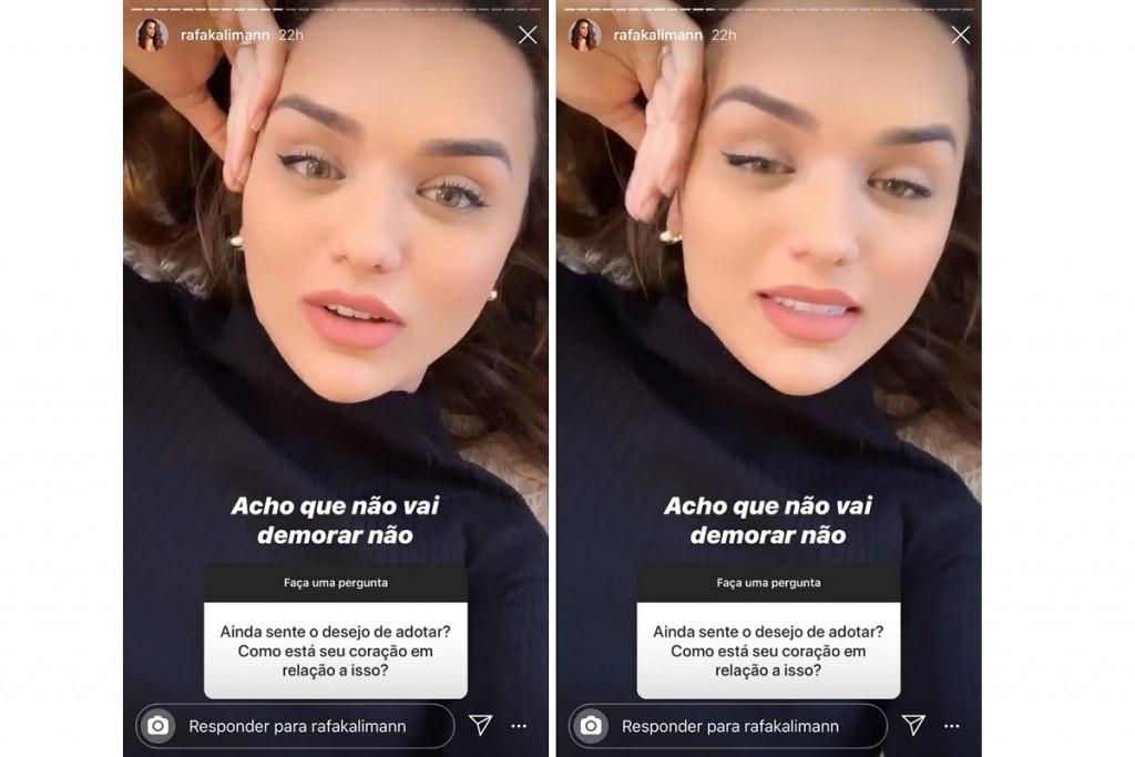 Na noite do último sábado, 27 de junho, Rafa Kalimann usou o Instagram para conversar e responder perguntas dos seus seguidores e acabou entregando o desejo e os planos de ser mãe em breve. “Hoje essa vontade é muito mais presente em mim”, ela confessou.