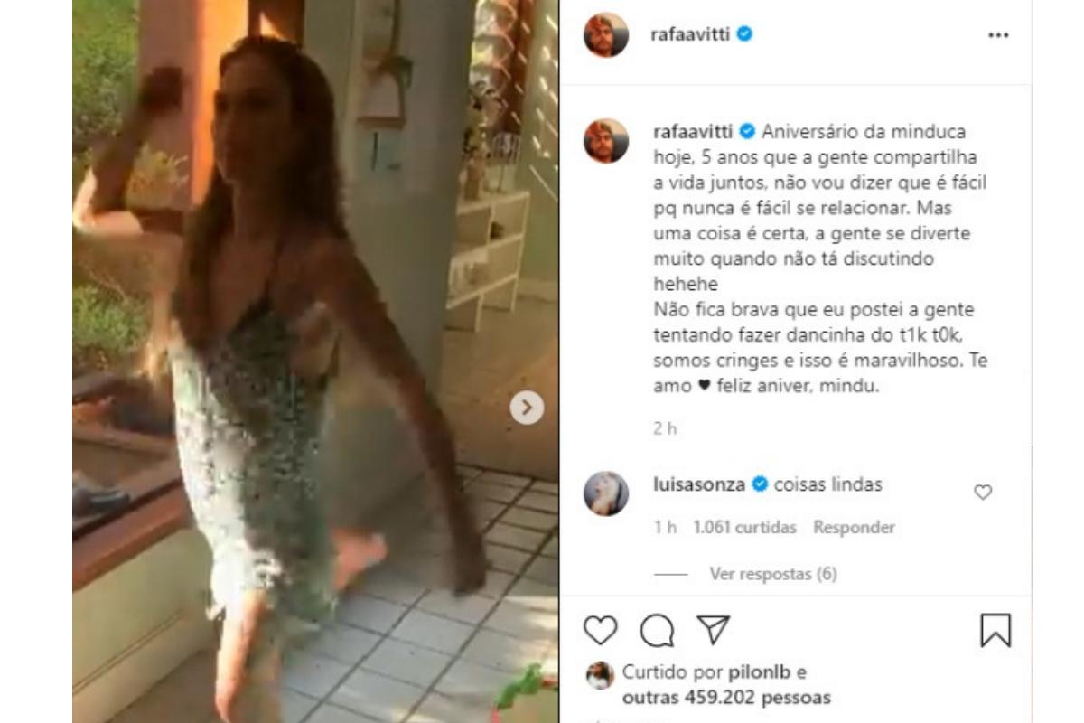 “Aniversário da minduca hoje, 5 anos que a gente compartilha a vida juntos, não vou dizer que é fácil porque nunca é fácil se relacionar. Mas uma coisa é certa, a gente se diverte muito quando não tá discutindo. Não fica brava que eu postei a gente tentando fazer dancinha do TikTok, somos cringes e isso é maravilhoso. Te amo”, escreveu o ator.