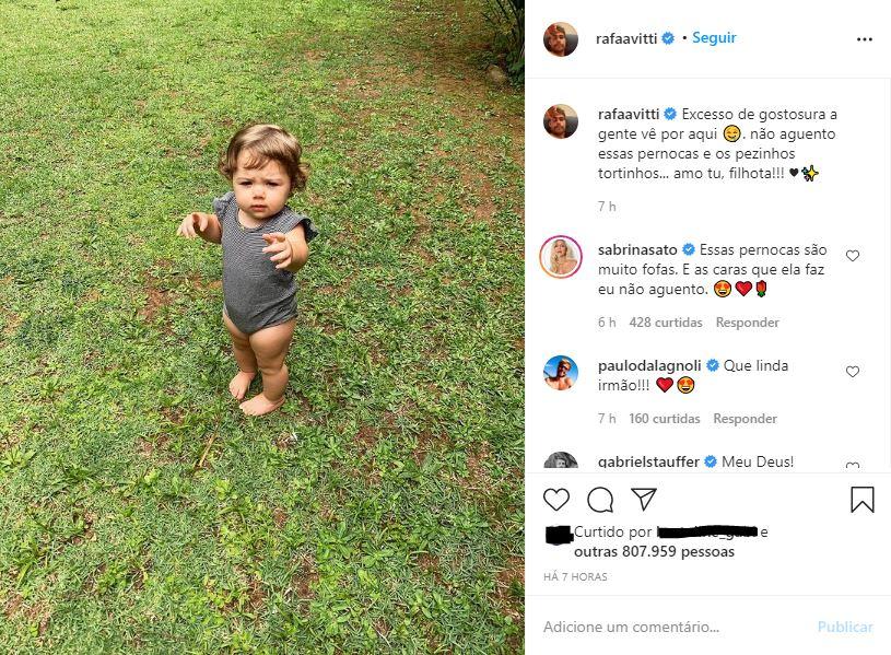 Os seguidores não aguentaram tanta fofura de Clara no clique: “Essas pernocas são muito fofas. E as caras que ela faz eu não aguento”, comentou Sabrina Sato. “Como assim ela já fica em pé sozinha????? Esses dias eu vi a Tata com a barriguinha”, escreveu uma seguidora.