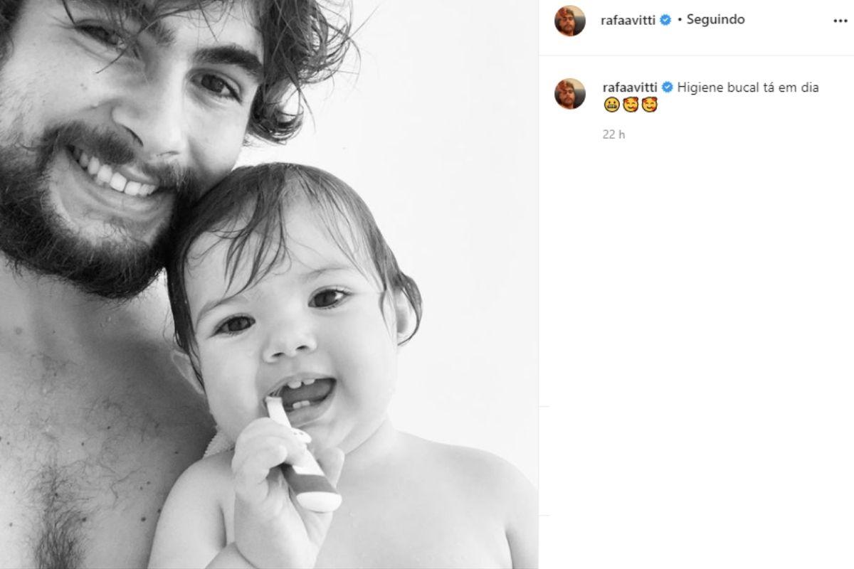 Na imagem, o pai aparece sorrindo ao lado da filha enquanto ela escova os dentes. “Higiene bucal tá em dia”, disse Rafael na legenda da publicação.
