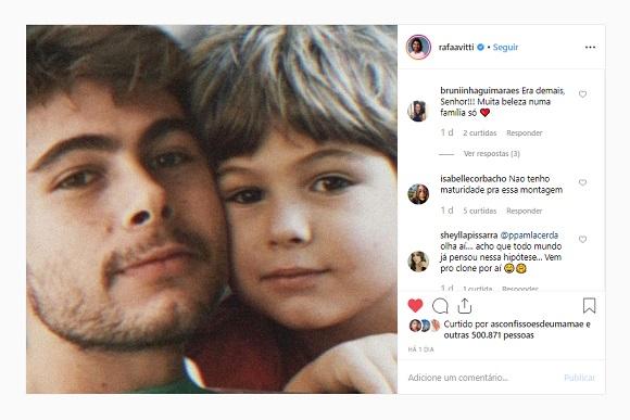 Numa fotomontagem publicada em sua conta do Instagram, Rafa aparece em duas versões, uma mais recente e outra ainda criança. “Imagina se vem outro clonezinho?”, escreveu o ator na legenda, seguido de um emoji de sorriso e um coração. Em seguida, ele explicou que era uma montagem dele, e não ele e o pai.