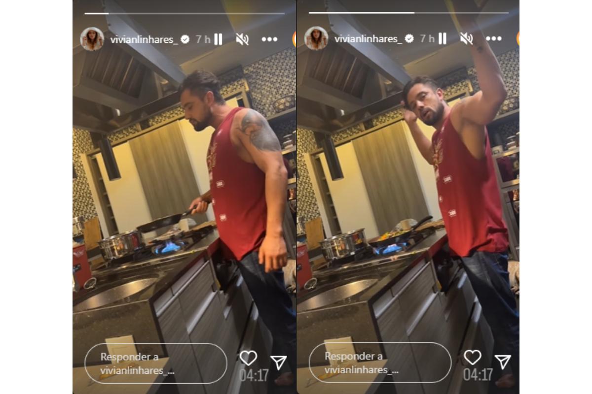 Rafael Cardoso apareceu nos stories da nova namorada cozinhando (Foto: reprodução/Instagram/@vivianlinhares_)