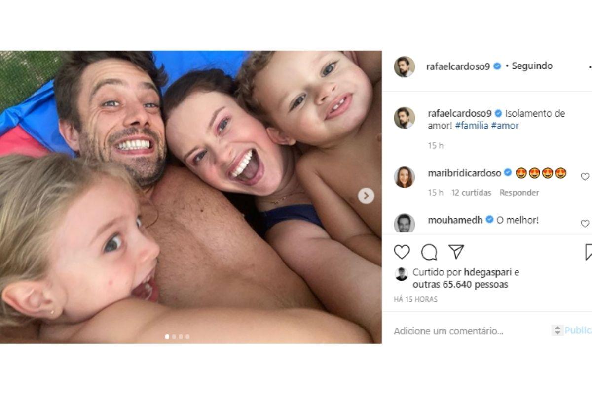 O ator Rafael Cardoso usou as redes sociais na última sexta-feira, 25 de setembro, para compartilhar uma foto cheia de amor ao lado da família. O famoso contou recentemente que havia sido testado positivo para a covid-19. “Isolamento de amor!”, escreveu ele ao compartilhar as fotos em que apareceu ao lado da esposa, Mariana Bridi, e dos dois filhos do casal, Aurora e Valentim.