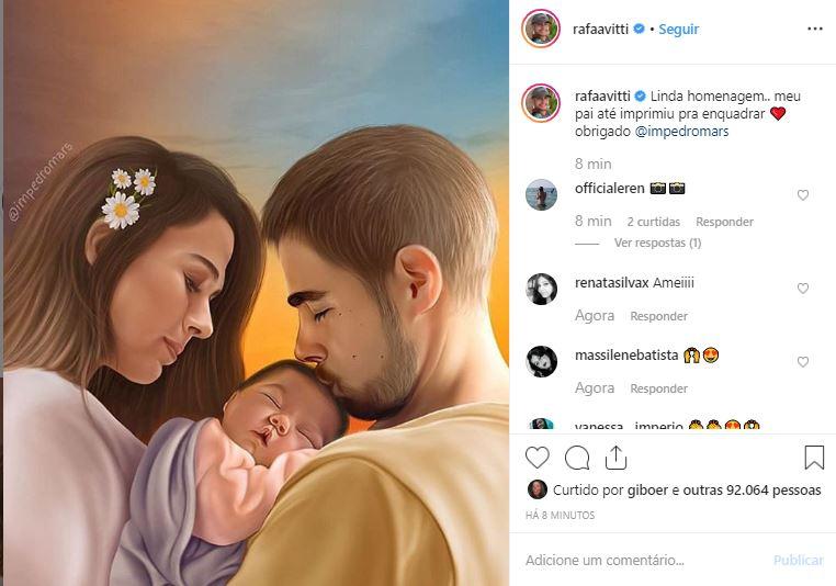 “Linda homenagem… Meu pai até imprimiu pra enquadrar. Obrigado, Pedro”, disse o ator na legenda da publicação. O artista também publicou a foto em seu Instagram. “Pintura digital dessa família linda! Tatá Werneck, Rafa Vitti e sua filhinha, Clara Maria. Espero que gostem!”, disse Pedro.