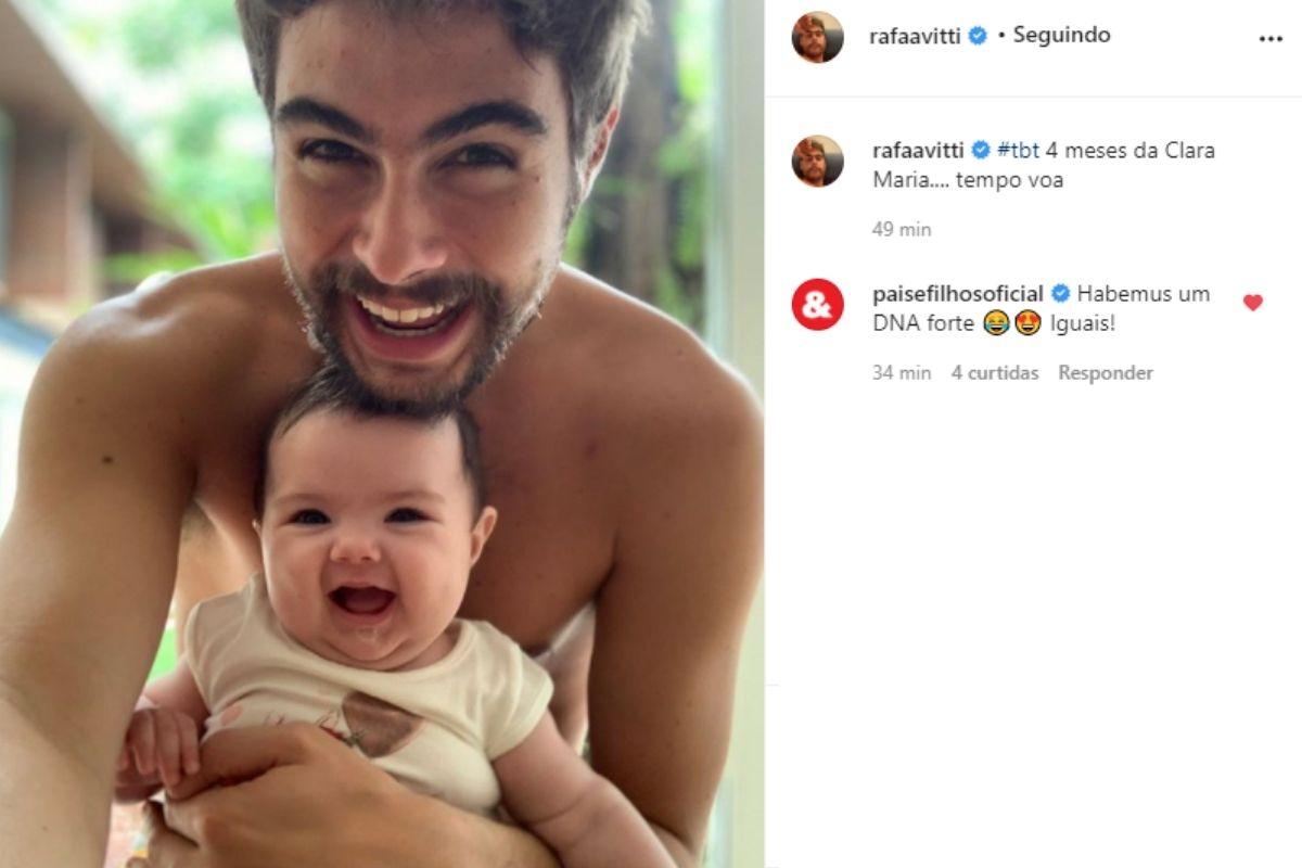Na legenda, Rafa comentou sobre a rapidez do crescimento da filha: “4 meses da Clara Maria…. tempo voa”. Os fãs da família não deixaram a oportunidade passar e elogiaram os dois, assim como a mãe, Tatá Werneck, que babou em cima do companheiro e da bebê: “Razao da minha vida”, escreveu ela. “O olhinho igual ao seu!”, notou uma seguidora. “A cópia, lindos”, disse outra.