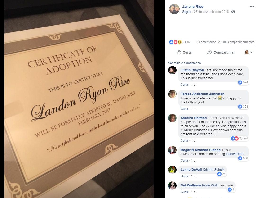 A mãe ainda explicou que com 5 anos, o menino já comentava sobre o desejo. “Ele dizia que queria ‘casar com o papai’ do jeito que eu fiz, assim teria o mesmo sobrenome.” Então, quando Landon se formou na quinta série, ele disse a seus professores que gostaria de ser chamado como Landon Rice. “Nesse momento soubemos que precisávamos fazer algo a respeito.”