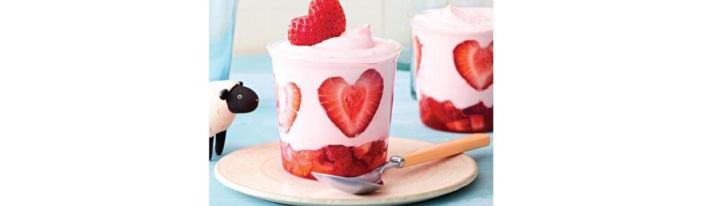 ✓Em copos transparentes, adicione no fundo os morangos picados com o restante do açúcar. Corte fatias da fruta em formato de coração e pressione nas paredes do recipiente. Adicione o creme e finalize com pedaço de morango por cima do doce.