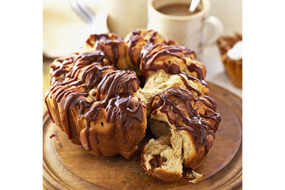 – Enquanto isso, derreta 8 xícaras de chá de pasta de chocolate em uma panela pequena em fogo baixo. Junte o leite até ficar homogêneo. Regue com o pão. Para servir, corte em fatias ou separe os pedaços.