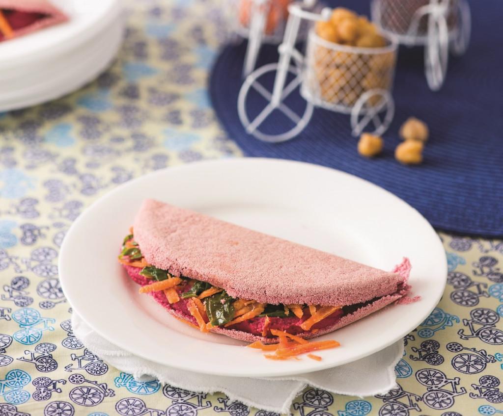 ✓ Faça a massa da tapioca em uma frigideira, coloque o homus, couve refogada em tiras e cenoura ralada.