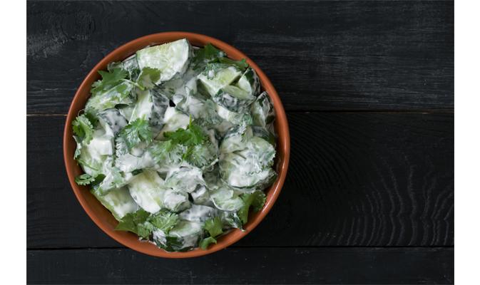Misture bem a hortelã picada, o pepino e o aipo numa vasilha. Em outra, bata o vinagre com iogurte. Regue a salada com esse molho, salpique com as folhas de hortelã e sirva.
