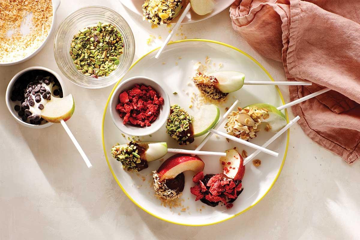 É fruta no palito – tudo pronto para a sobremesa. Enfie palitos de pirulito nas fatias de maçã, e mergulhe em molho de caramelo comprado em lojas ou chocolate meio amargo derretido. Coloque nozes, morangos, coco ou granola picados, triturados e torrados para fazer a cobertura e sirva.