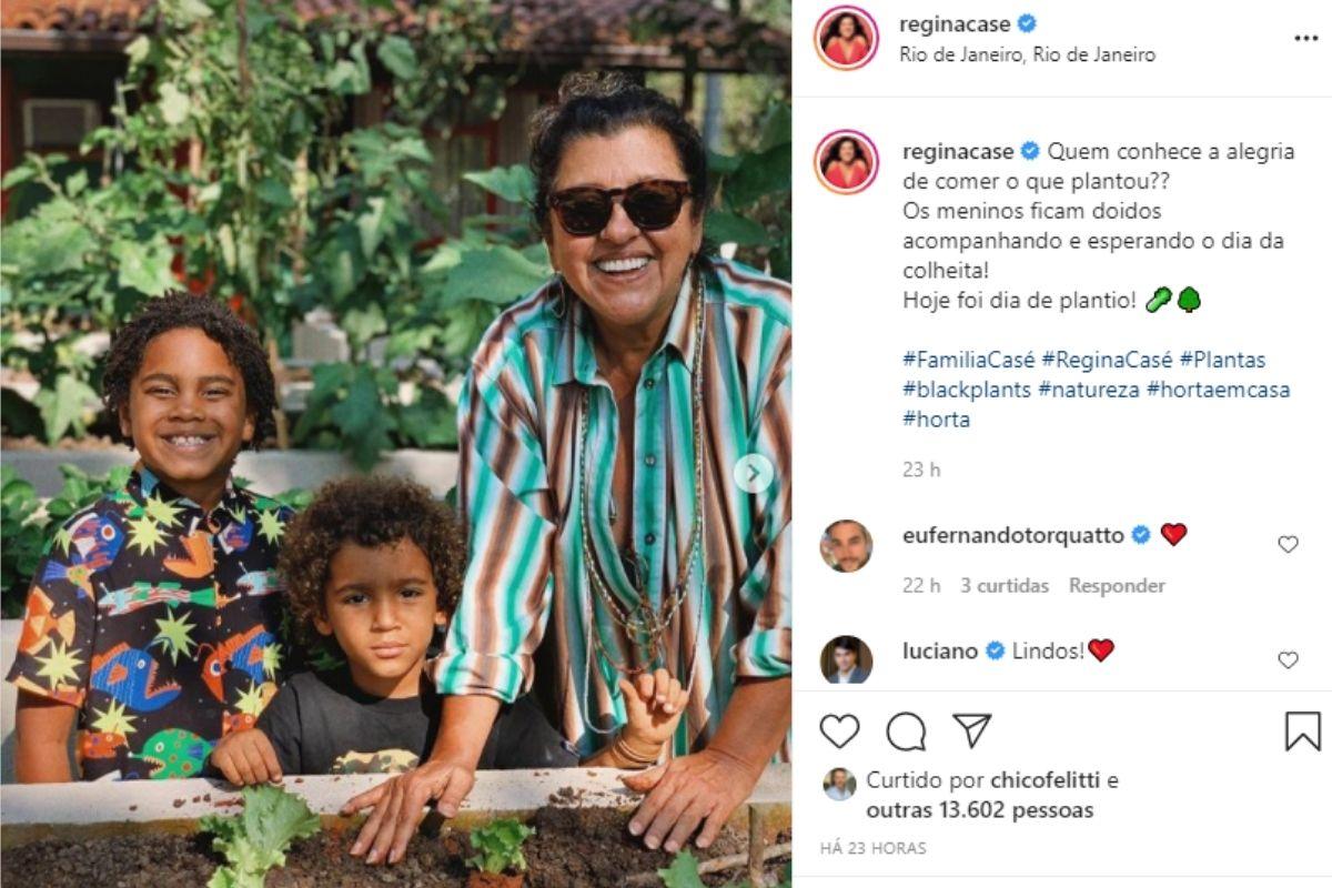 Regina Casé usou as redes sociais para compartilhar um momento super especial ao lado da família. Na foto, ela aparece ao lado dos filhos, Benedita, de 32 anos e Roque, de 8, e do neto, Brás , de 4 anos, ao lado da horta da família.
