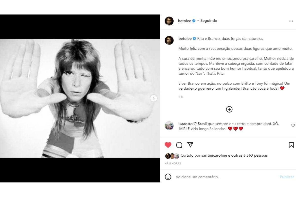 Beto Lee, filho de Rita Lee, usou as redes sociais nesta terça-feira, 12 de abril, para compartilhar um relato após a notícia da cura do câncer da cantora. Rita Lee estava enfrentando um tumor no pulmão e conseguiu vencer a batalha. A notícia sobre a saúde da cantora também foi revelada nesta segunda-feira, 12 de abril.