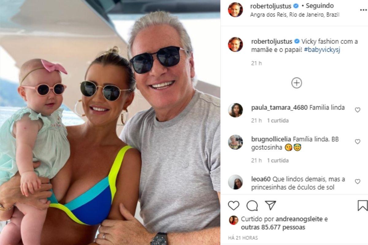 O empresário e apresentador Roberto Justus usou as redes sociais no último domingo, 25 de outubro, para compartilhar uma foto cheia de amor e estilo ao lado da esposa, Ana Paula Siebert e da filha, Vicky. Na imagem, os três aparecem usando óculos escuros, aproveitando o dia em Angra dos Reis, no Rio de Janeiro. “Vicky fashion com a mamãe e o papai!”, escreveu o famoso ao publicar a foto.