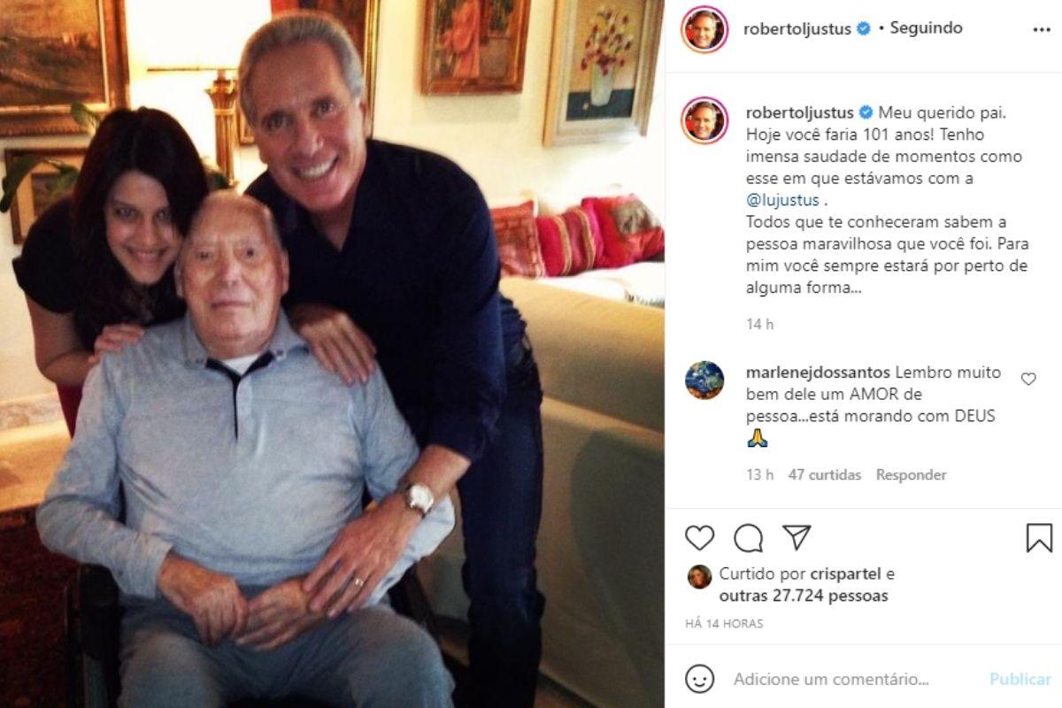 “Meu querido pai. Hoje você faria 101 anos! Tenho imensa saudade de momentos como esse em que estávamos com a @lujustus . Todos que te conheceram sabem a pessoa maravilhosa que você foi. Para mim você sempre estará por perto de alguma forma…”, escreveu ele ao publicar a foto. Na imagem, ele e a filha, Luiza Justus, aparece ao lado de Jano, que está sentado em uma cadeira.