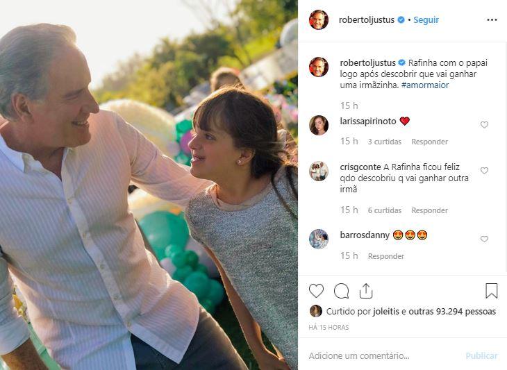 Também no domingo, Roberto Justus deixou os seguidores encantados ao compartilhar a reação da filha Rafaella, de 10 anos, quando descobriu que teria uma irmã. No Instagram, o empresário publicou uma foto ao lado da filha durante o chá revelação. “Rafinha com o papai após descobrir que vai ganhar uma irmãzinha. #amormaior”, disse na legenda da publicação. Rafaella Justus é fruto do relacionamento do empresário com a apresentadora Ticiane Pinheiro.
