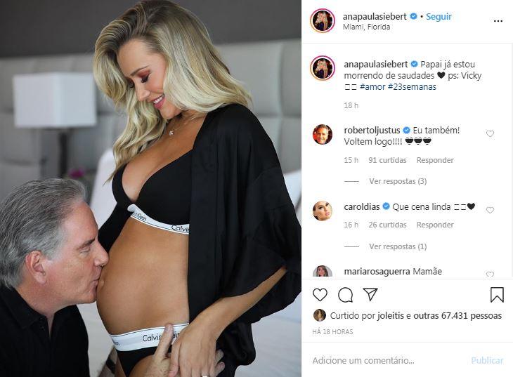 “Papai, já estou morrendo de saudades. Ps: Vicky #amor #23semanas”, disse Ana Paula na legenda da publicação. Na foto, a modelo está mostrando como a barriga cresceu, enquanto Roberto Justus dá um beijo na filha. A modelo está no 6º mês de gestação e está esperando uma menina, que se chamará Vicky.