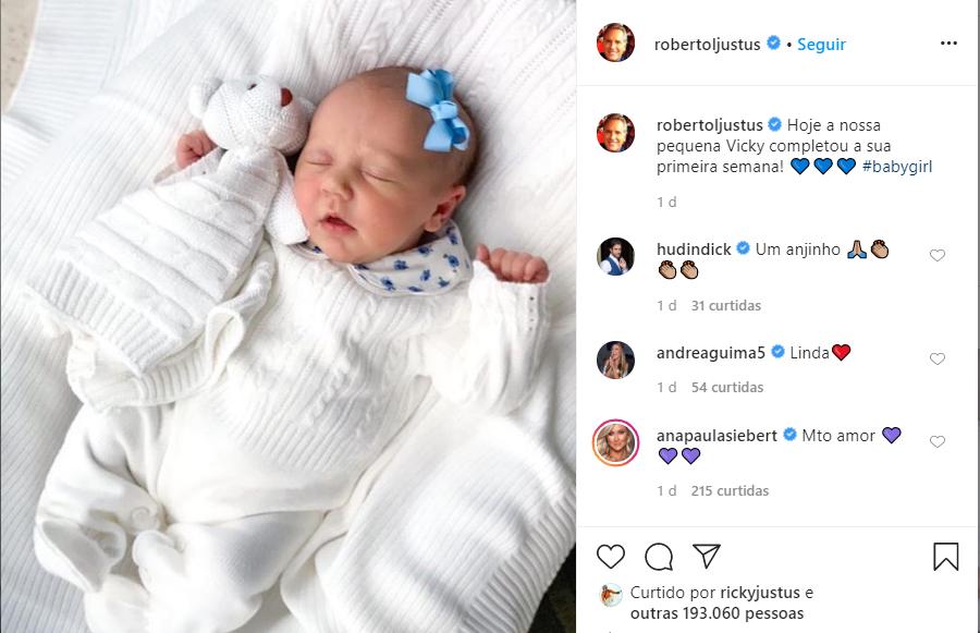 “Hoje a nossa pequena Vicky completou a sua primeira semana, “baby girl”, escreveu ele na legenda da foto, que mostra a menina em uma roupa branca de tricot com um urso de pelúcia ao lado. A publicação contou com muitos elogios de familiares e fãs.
