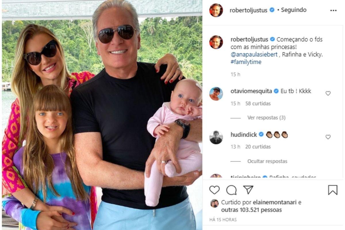 O empresário e apresentador Roberto Justus usou as redes sociais para compartilhar ima foto junto à família. Com a imagem, o famoso fez uma homenagem à esposa e às filhas. “Começando o fds com as minhas princesas! Ana Paula Siebert, Rafinha e Vicky”, escreveu junto à foto.