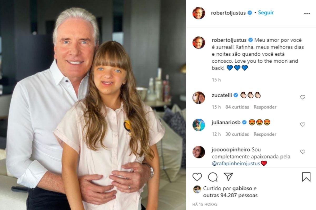 Na legenda, ele se declarou para a Rafella Justus, de 11 anos. “Meu amor por você é surreal! Rafinha, meus melhores dias e noites são quando você está conosco. Love you to the moon and back!”, escreveu ele. A filha respondeu a declaração: “Te amo mais que tudo nesse universo”.