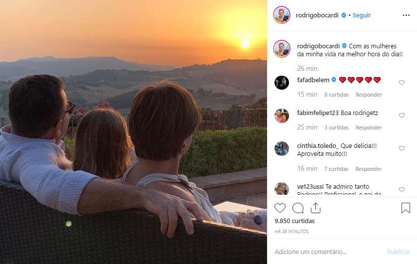 Bocardi publicou uma foto ao lado da mulher, Cláudia, e da filha, Anne, sentadas e curtindo o pôr do sol e a véspera de feriado em família. “Com as mulheres da minha vida na melhor hora do dia!!”, escreveu na legenda.