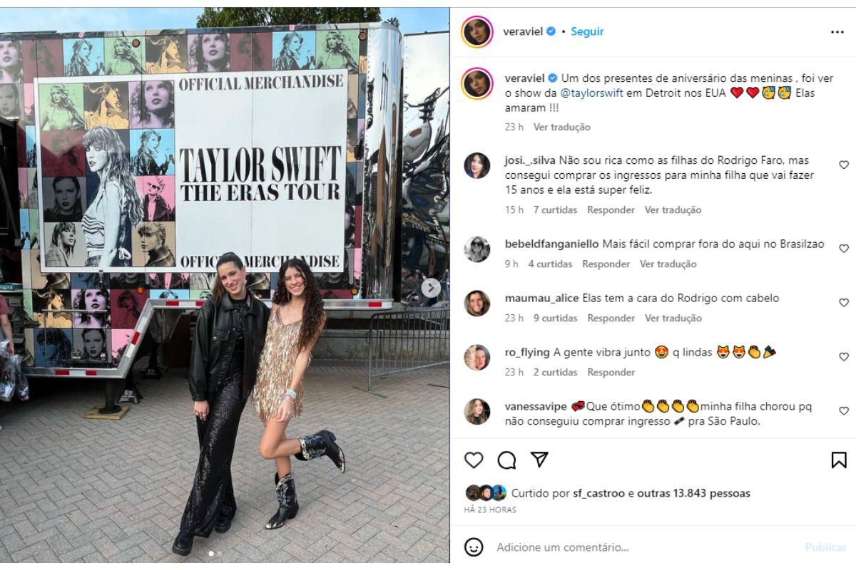 Mas foi na terça-feira, 20 de junho, que Vera publicou em seu Instagram o verdadeiro e luxuoso presente que deu, ao lado de seu marido, para as suas filhas. “Um dos presentes de aniversário das meninas , foi ver o show da @taylorswift em Detroit nos EUA. Elas amaram!!!”, publicou em suas redes sociais. Cheias de estilo, as irmãs apareceram curtindo o show da cantora lado a lado.