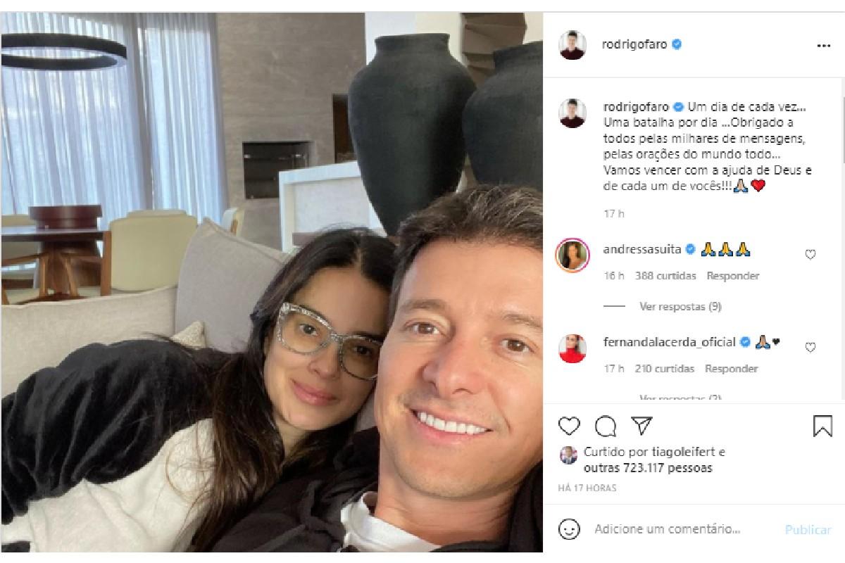 Nesta terça-feira (06), Rodrigo Faro compartilhou mais uma foto na rede social para comentar sobre a situação da família, que contraiu covid-19. Ao lado da esposa, Vera Viel, o apresentador mandou um recado na legenda.