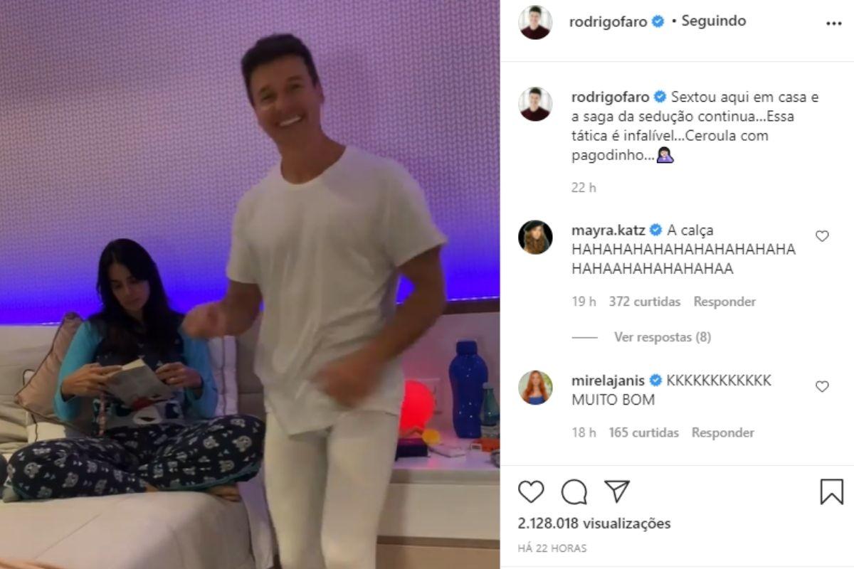 Os internautas amaram a brincadeira e logo começaram a comentar. “Dança gatinho, dança”, escreveu uma seguidora, brincando com um quadro antigo do programa de Rodrigo. “E essa calça? kkkk”, reparou outra. “Seria melhor com um terno lindo e uma rosa na boca e dançando um tango kkkkkk”, opinou uma terceira. Veja a publicação abaixo e assista ao vídeo clicando aqui.