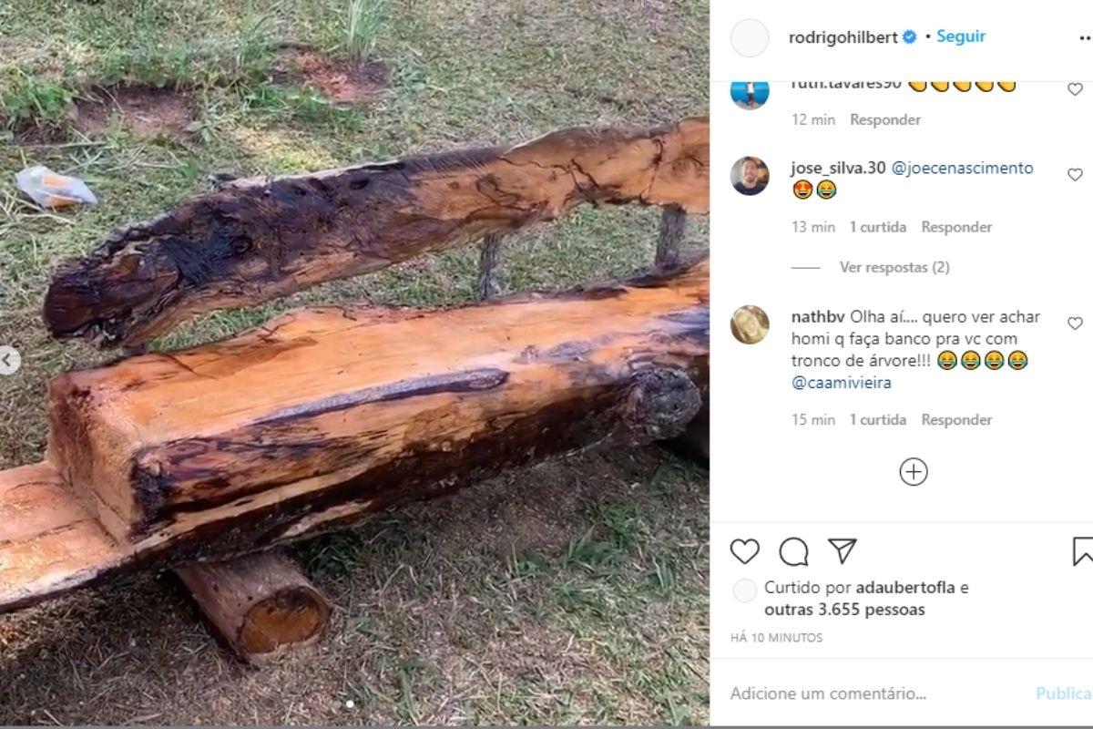 Nos comentários, os seguidores ficaram impressionados: “Quem jogou a fórmula fora desse homem?”, brincou uma. “Esse homem não existe”, escreveu outra. “Olha aí…. quero ver achar homem que faça banco para você com tronco de árvore!!!”, completou mais uma.