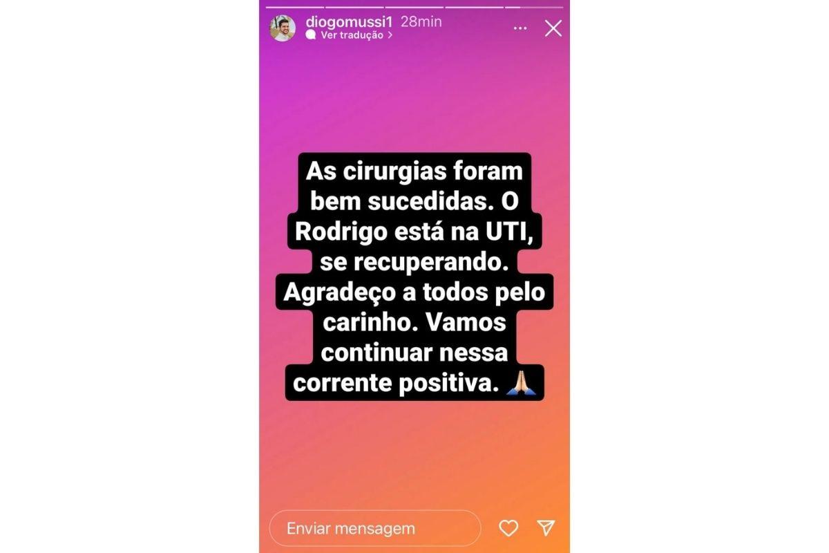 “As cirurgias foram bem sucedidas. O Rodrigo está na UTI, se recuperando. Agradeço a todos pelo carinho. Vamos continuar nessa corrente positiva”, escreveu Diogo Mussi em seu perfil do Instagram.